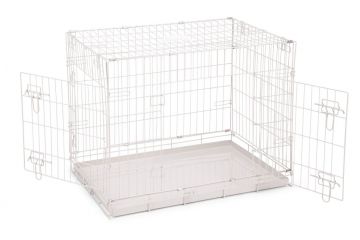 Der Beeztees Puppy Drahtkäfig mit zwei Türen ist ein Hilfsmittel bei der Welpen-Erziehung. Er kann unterstützend beim Erlernen der Stubenreinheit und beim Alleinsein eingesetzt werden. Außerdem bietet sie dem Welpen einen geschützten Rückzugsort. Bei der Wahl des Drahtkäfigs ist es wichtig, dass die Gitterbox genügend Raum für den Welpen zum Stehen, sich Drehen und Hinlegen bietet. Durch die zwei Türen kann die Gitterbox flexibel aufgestellt werden. Der Metallboden kann zur leichten Reinigung entnommen werden. Ein separat erhältliches, passendes Kissen oder das Beeztees Puppy Sleeper Set sorgen für extra Liegekomfort und eine freundliche Optik. Erhältlich in zwei Größen und zwei Farben.Größenangaben: 62 x 44 x 49 cm oder 78 x 55 x 61 cm.