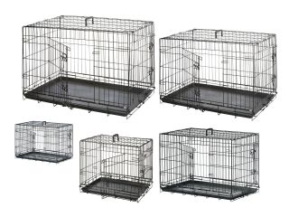 Der schwarze Drahtkäfig in verschiedenen Größen bietet Hunden einen sicheren Rückzugsort. Ob als Transportbox auf Reisen oder als ruhiger Platz zu Hause, in der Box kann sich der Hund stets geschützt und geborgen fühlen. Dabei erlaubt die Gitterbox dem Hund eine freie Sicht auf das Geschehen um sich herum. Er fühlt sich also weder isoliert, noch wird dem Vierbeiner der Blickkontakt zur Bezugsperson verwehrt. Und umgekehrt hat auch der Halter sein Tier stets im Blick. Dank einer herausziehbaren Kunststoff-Bodenwanne kann der pflegeleichte Käfig einfach gereinigt werden. Ein Tragegriff erleichtert den Transport. Die Käfige sind, bis auf die kleinste Größe, mit zwei Türen ausgestattet. Der so mögliche Ein- und Ausstieg an Seite und Front erhöht die Flexibilität sowie die Stellmöglichkeiten.