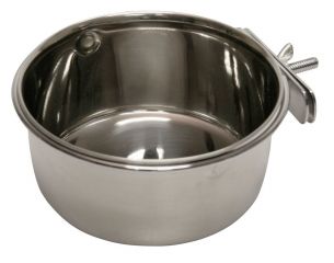 Futter- und Wassernapf aus rostfreiem Edelstahl, komplett mit Halterung zur Anbringung an Gitterwänden.