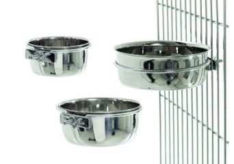 Futter- und Wassernapf aus rostfreiem Edelstahl, komplett mit Halterung zur Anbringung an Gitterwänden.